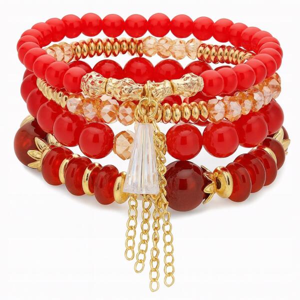 4 db-os szett Női karkötő piros gyöngyökkel, arany elemekkel