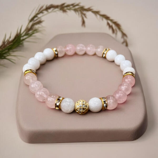 Tejkvarcból és Rózsakvarcból készült, finom, gyengéd megjelenésű karkötő. 8mm-es arany cirkónia gyönggyel és strasszokkal diszítve. Nem tudod, hogyan válassz csuklóméretet?Kattints ide és segítünk!