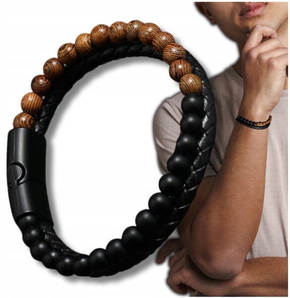 Férfi bőr karkötő természetes bőr szíjjal és ásványgyöngyökkel (5905884063194)ALLEGRO
