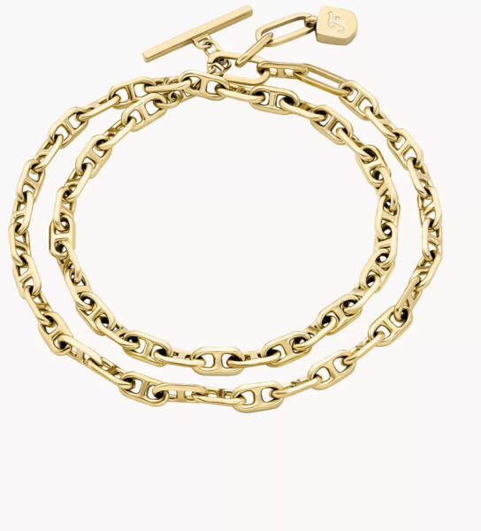 Az aranyszínű Fossil Heritage D‑Link karkötő (JA7236710) egy időtlen darab, ami klasszikus eleganciát és modern csillogást ötvöz. A finom, de jellegzetes D‑link lánc struktúrája stabil, mégis nőies megjelenést biztosít, míg a kristályok diszkrét ragyogása minden mozdulatnál megragadja a fényt. A sárgaréz anyag arany tónusa melegséget kölcsönöz, miközben a toggle zár kényelmesen illeszkedik a csuklóra, és egy kis vintage hangulatot is ad a darabhoz. A karkötő hossza (355 mm + 35 mm hosszabbítás) lehetőséget ad arra, hogy különböző stílusokkal – például órákkal vagy más karkötőkkel – kombináld anélkül, hogy túl zsúfolt lenne. A 3,7 mm szélesség távolról sem tolakodó, de mégis karakteres, így jól érvényesül, ha önmagában viselik, ugyanakkor remek kiegészítő réteg is lehet egy összetett karékszer-stylingban. Ez a darab nappali alkalmakra éppúgy jó választás, mint egy elegáns esti összejövetelre: viselheted magányosan vagy rétegezve, és mindig stílusos megjelenést kölcsönöz. Tökéletes ajándék is lehet: az Heritage kollekció strapabíró anyagai és klasszikus formavilága hosszú távra szól.