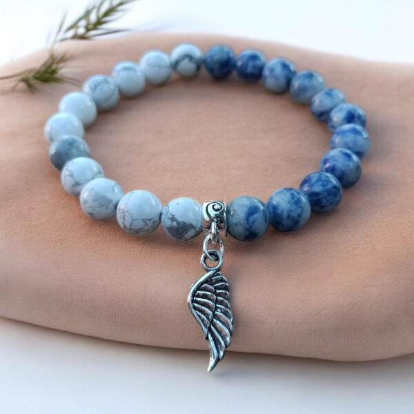 Howlitból és Szodalitból készült, ezüst színű angyalszárny medállal díszített, sugárzó karkötő. Nem tudod, hogyan válassz csuklóméretet?Kattints ide és segítünk!