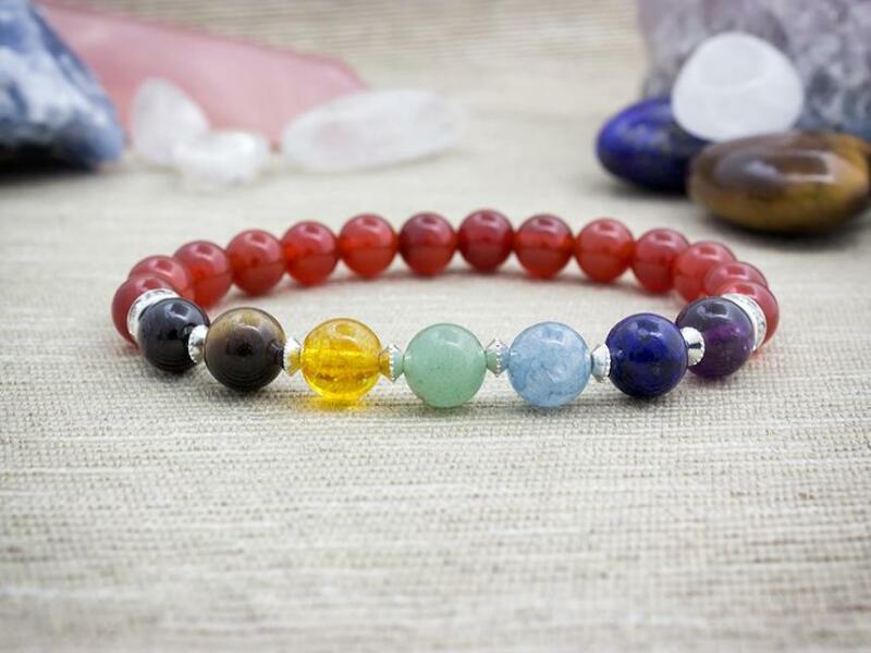 A 8 mm-es ásvány gyöngyök gumira vannak felfűzve. Csakra karkötő ásványai: ametiszt, lápisz, akvamarin, citrin, karneol, gránát, tigrisszem, aventurin.