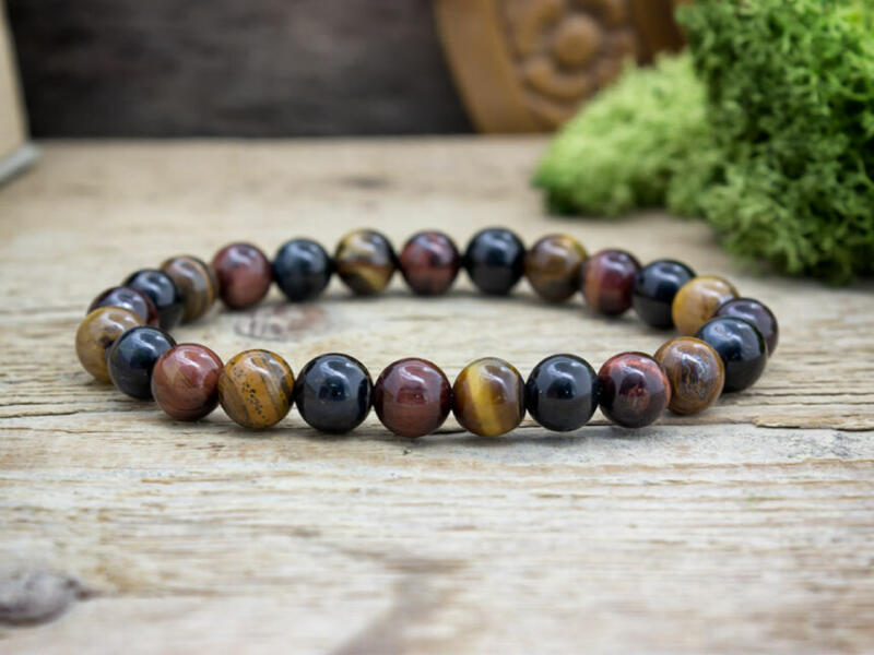 Három szem ásvány karkötő. Macskaszem, tigrisszem és sólyomszem ásvány golyókból gumira fűzött karkötő.