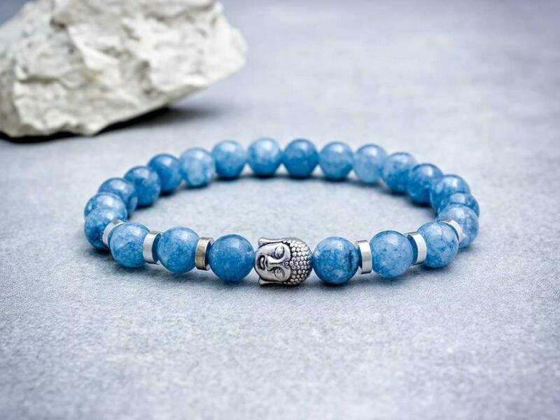 8 mm-es akvamarin ásvány gyöngyökből speciális gumira fűzött ezüst színű Buddha fejjel díszített karkötő.