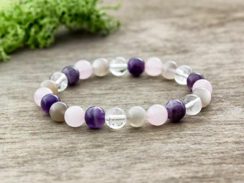 Az ásvány golyók gumira vannak felfűzve. A karkötő ametiszt, rózsakvarc, holdkő és hegyikristály ásványokból áll.