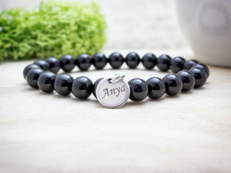 A ónix ásvány golyók gumira vannak felfűzve. Amit az ónixról érdemes tudnod: Az ónix általában fekete, néha előfordulhat fehér, szürkés csíkozódással is.