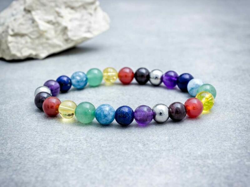 Az ásvány golyók gumira vannak felfűzve. Csakra karkötő ásványai: gránát, karneol, citrin, aventurin, akvamarin, lápisz lazuli, ametiszt és hematit.