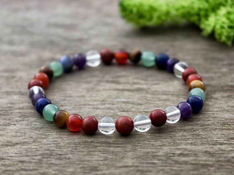 Az ásvány golyók gumira vannak felfűzve. Csakra karkötő ásványai: jáspis, hegyikristály, karneol, tigrisszem, aventurin, szodalit, ametiszt.