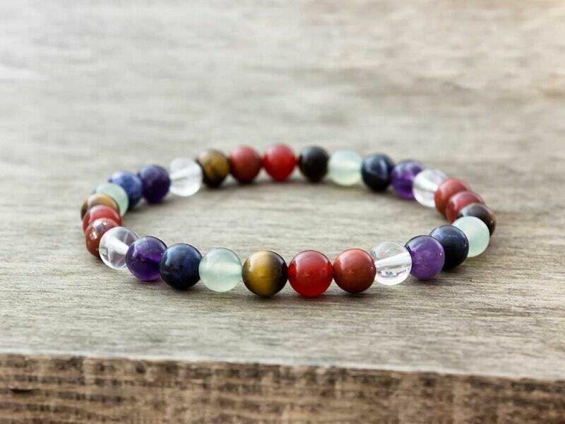 Az ásvány golyók gumira vannak felfűzve. Csakra karkötő ásványai: Hegyikristály, ametiszt, szodalit, jáde, tigrisszem, karneol, jáspis.