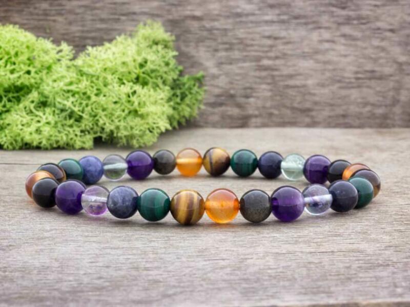 Az ásvány golyók gumira vannak felfűzve. Csakra karkötő ásványai: obszidián, karneol, tigrisszem, malachit, szodalit, fluorit, ametiszt.