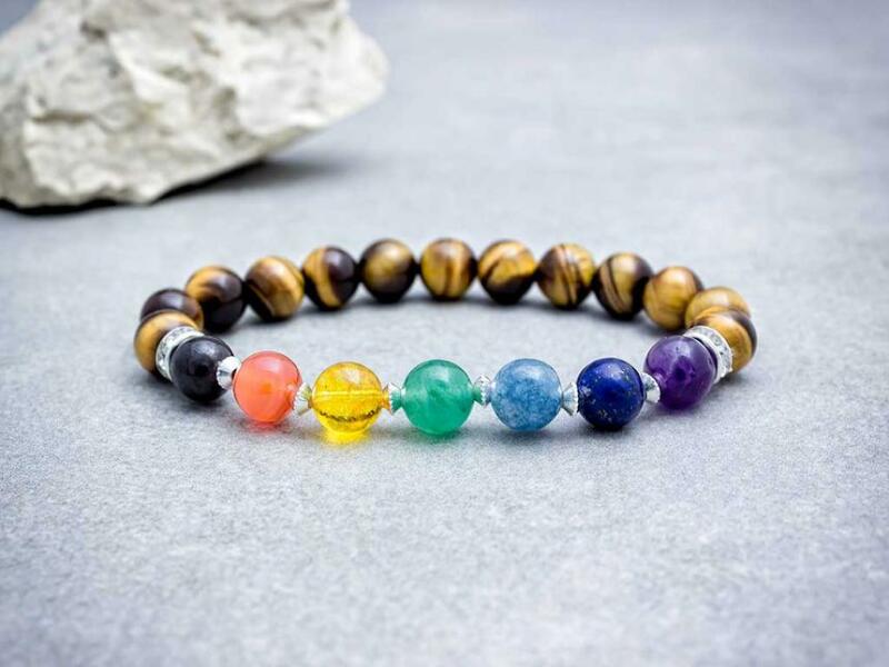 Az ásvány golyók gumira vannak felfűzve. Csakra karkötő ásványai: tigrisszem, ametiszt, lápisz, akvamarin, aventurin, citrin, karneol, gránát.