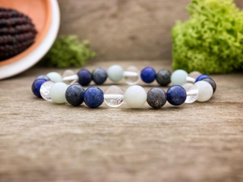 Ezt a szerencsehozó karkötőt kifejezetten a halak jegy szülötteinek terveztük, készítettük. A karkötő halak (02.20. - 03.20. ) jegyhez passzoló hegyikristály, lápisz lazuli, amazonit és szodalit 8mm-es ásvány gyöngyökből áll. Az ásvány golyók gumira vannak felfűzve, így kényelmes a hordása. Halak (02.20. - 03.20. ) horoszkóp jellemzése: E jegy szülöttje intenzív lelki életet él. Általában a pillanatnyi hangulat hatására cselekszik, ezért tettei nem következetesek, és gyakran kiszámíthatatlanok. Nagyon tehetséges, és saját szorgalmának köszönhetően kiváló eredményeket képes elérni. Ennek ellenére önmagával sokszor elégedetlen, és ez könnyen önsajnálkozásba megy át. Fantáziája igen gazdag, az örökös álmodozás jellemzi mindennapjait. Könnyen befolyásolható, és alkalmazkodóképessége nem ismer határokat. Életében nagy megpróbáltatásokban van része, de ezek nem törik meg, és szerencsésen kerül ki a konfliktushelyzetekből. Önfeláldozása nem ismer határokat, az emberekhez általában megértéssel és szeretettel közeledik. Ha sérelem éri, könnyen válhat depresszióssá. Párjához hűséges, és a rajongásig képes szeretni mindaddig, amíg érzi, hogy viszontszeretik. A karkötő ásványainak hatásáról az alábbiakban olvashatsz röviden: Hegyikristály hatása: A hegyikristály minden gyógykövek koronázatlan királya, amely fokozza az összes többi kő hatását. Kiegyensúlyozó, nyugtató hatással bír a lélekre. Hat a szellemi kimerültség ellen. Aura tisztító, erősítő és védelmező. Növeli a kifejezőerőnket, kiegyenlíti a lelki diszharmóniát, aktiválja a felettes tudatunkat. Segít a felettes énnel való összeköttetés megteremtésében, ezért kitűnően használható meditáció alatt. Szellemi fejlődésünket is segíti, illetve szellemi határaink kitágulását. Javítja az intuíciónkat, telepatikus képességeinket. Használhatjuk a tér atmoszférájának tisztítására, a káros környezeti sugárzás csökkentésére, illetve a lelki sebek gyógyítására. Lápisz lazuli hatása: A lazurit figyelmet és ugyanakkor nyugalmat hoz ki belőlünk, hogy rátalálhassunk a belső igényeinkre és komolyan vegyük azokat. Segít, hogy kiálljunk a magunk igaza mellett, támogatva ezzel önbizalmunkat. A homlokcsakrához kapcsolódva tudatosulnak az elnyomott érzelmek, szabaddá válik az út az intuíciónk számára. Még a szégyenlős emberek is nyitottabbá válnak, könnyebben közelednek és teremtenek kapcsolatot a körülöttük lévő világgal. A kőben lévő pirit segít a mindennapi életünk jobb szervezésében, a mindennapi dolgainkat megerőltetés nélkül végezhetjük el segítségével. A párna alá helyezett lazurit kődarabkának köszönhetően reggel frissen és fáradtság nélkül kelhetünk fel ágyunkból. A lazurit segít problémáink feldolgozásában, sorsunk elfogadásában, így megajándékoz egy kiegyensúlyozottabb, boldogabb élettel. Amazonit hatása: Az amazonit nyugtató hatással bír az idegrendszerre. Mivel az idegrendszer kontrollálja érzelmeinket, így ez a kő csillapítja a bennünk lévő feszültséget és segítenek nyugalmunk megőrzésében, akár bosszantó élethelyzetekben is. Depresszió és érzelmi problémák esetén felébreszti az elvesztett életörömöt, megnyitja a szívet. Mindennapjaink során az amazonit segít lazábbnak lenni, növeli a kitartásunkat. Szodalit hatása: A szodalit a hősök köve, ha ugyanis bátorságra van szükségünk ahhoz, hogy kimerjünk állni a meggyőződésünk mellett, a szodalit az az ásvány, amit feltétlen magunknál kell tartanunk. Hordjuk magunkkal, ha tudjuk, hogy konfrontációba fogunk keveredni valakivel és meg szeretnénk vívni a magunk igazát. Általában segít kifejezni magunkat, mind szóban, mind írásban, hiszen a szodalit megnyitja a torokcsakrát. A homlokcsakrán keresztül segíti a hozzáférésünket intuitív oldalunkhoz. Az intuíció mellett objektivitásunk fejlesztésében is részt vehet ez az ásvány, elsősorban abban segít, hogy önmagunkat kívülről láthassuk és objektívebben, kevésbé kritikusan ítélhessük meg. A közösségi kapcsolataink erősítésére is alkalmas.