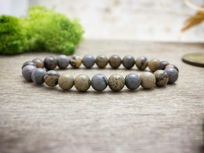 Jáspis ásvány karkötő. Az ásvány golyók gumira vannak felfűzve.
