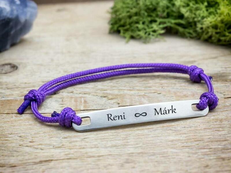 Ezt az egyszerű, de mégis egyedi karkötő ajándék ötlet ünket e gy microcord zsinór , és egy acél medál alk ot ja . A karkötőt egy lap alakú 49×6,3 mm-es méretű elegáns acél medál díszíti, amit gravírozunk , így személyesebbé téve az ajándékot . A nemesacél más néven orvosi fém medál nem allergizál , ezért fémre érzékenyeknek is bátran ajánljuk . Mindemellett az acél medál nagyon strapabíró , nem kopik , nem színeződik el , rendkívül hosszú ideig megőrzi eredeti szépségét . A karkötő microcord zsinóros kivitelének köszönhetően minden méretű csuklón kényelmes viselet. Speciális csúszócsomók segítségével van elkötve a zsinór, így méretre tudod igazítani. Fontos, hogy óvatosan húzd a zsineget a csomókon keresztül. A karkötő 15, és 21 cm-es csuklóméret között állítható. A microcord zsinór nagyon tartós, és könnyű nylon anyag, átmérője 1,7 mm.