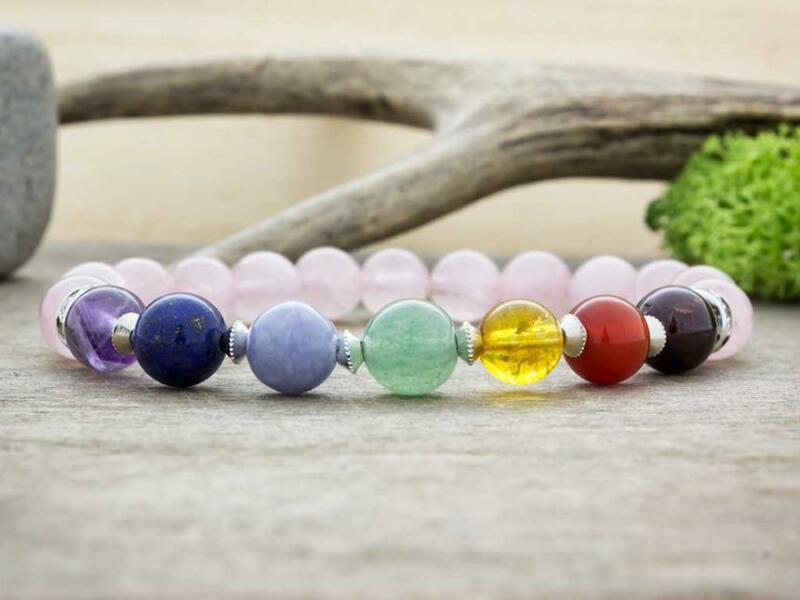A 8mm-es "B" minőségű ásvány gyöngyök gumira vannak felfűzve. Csakra karkötő ásványai: rózsakvarc, ametiszt, lápisz, kalcedon, aventurin, citrin, karneol, gránát.