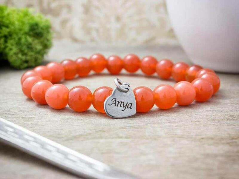 Valódi karneol ásványgyöngyös fűzött gumis karkötő "Anya" felirattal gravírozott szív alakú nemesacél medállal Ezt a külön édesanyák részére készített ajándék ötlet ünket 8 mm-es karneol ásványgyöngyök alkotják .