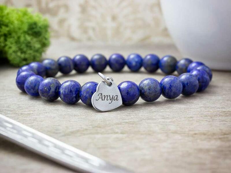 Valódi lápisz lazuli ásványgyöngyös fűzött gumis karkötő "Anya" felirattal gravírozott szív alakú nemesacél medállal Ezt a külön édesanyák részére készített ajándék ötlet ünket 8 mm-es lápisz lazuli ásványgyöngyök alkotják .