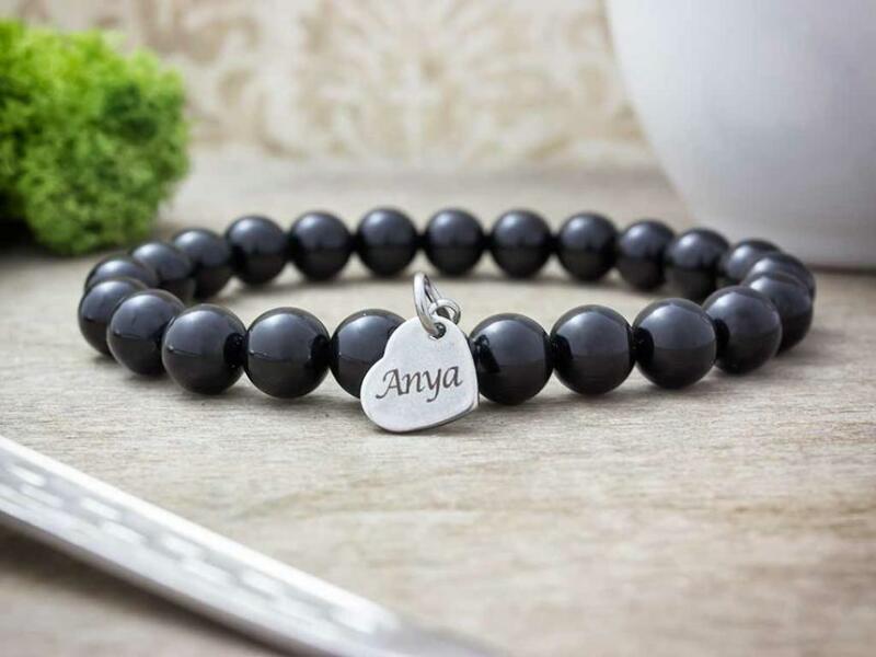 Valódi ónix ásványgyöngyös fűzött gumis karkötő "Anya" felirattal gravírozott szív alakú nemesacél medállal Ezt a külön édesanyák részére készített ajándék ötlet ünket 8 mm-es ónix ásványgyöngyök alkotják .