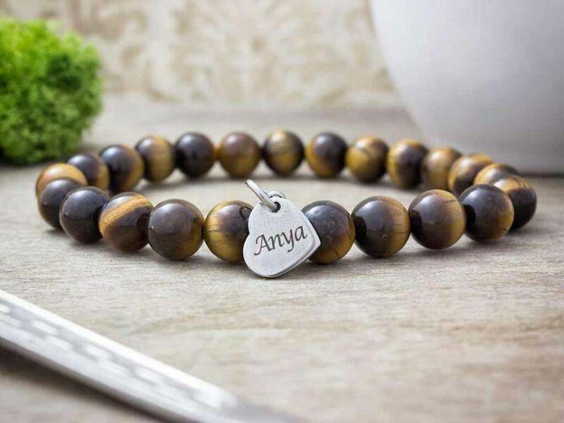 Valódi tigrisszem ásványgyöngyös fűzött gumis karkötő "Anya" felirattal gravírozott szív alakú nemesacél medállal Ezt a külön édesanyák részére készített ajándék ötlet ünket 8 mm-es tigrisszem ásványgyöngyök alkotják .