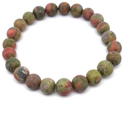 Unakit matt golyó karkötő 8mm – 100% Valódi Unakit KarkötőExkluzív 8mm-es Unakit ásvány gyöngyökből készült karkötőEz a különleges karkötő 8mm-es Unakit ásvány gyöngyökből lett gondosan megalkotva. A természetes ásványok nemcsak esztétikai értékkel bírnak, hanem erőteljes energetikai hatással is rendelkeznek. A 100% valódi Unakit gyöngyök segítenek a testi és lelki egyensúly megteremtésében, miközben elegáns kiegészítőként is megállják a helyüket. Spirituális és energetikai hatásokA Unakit ásvány híres arról, hogy: