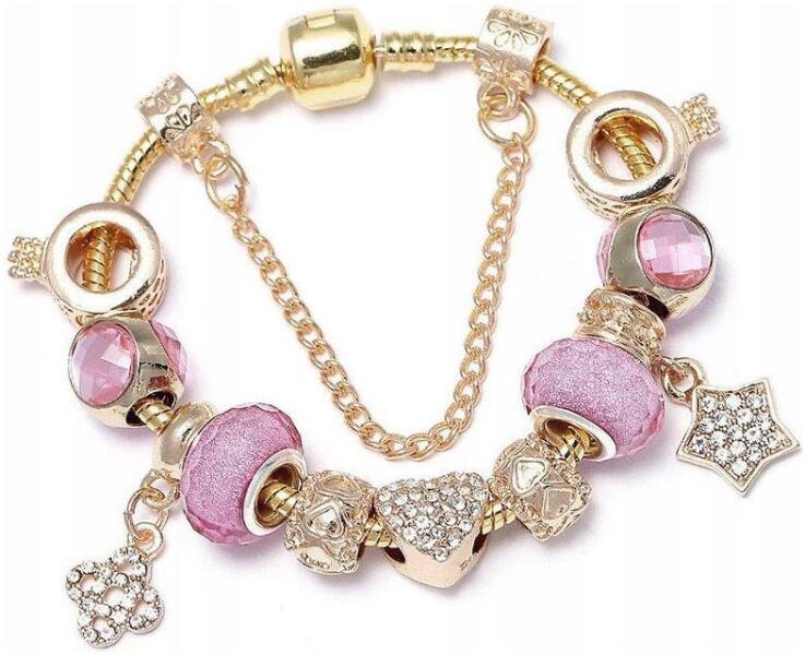 Rózsaszín Női Arany Moduláris Karkötő Charms Gyöngyökkel, ajándék medálokkal (F133)ALLEGRO