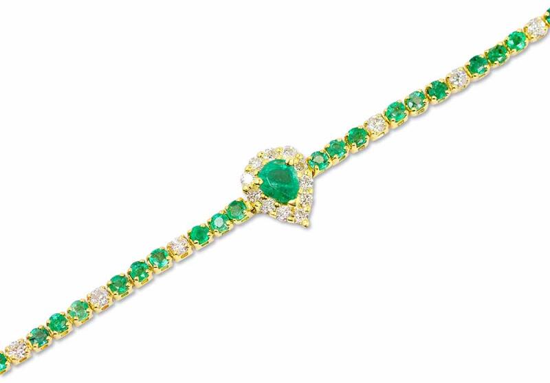0,8 karát zöld smaragddal sorba díszített karkötő 18 karátos aranyból középen cseppel